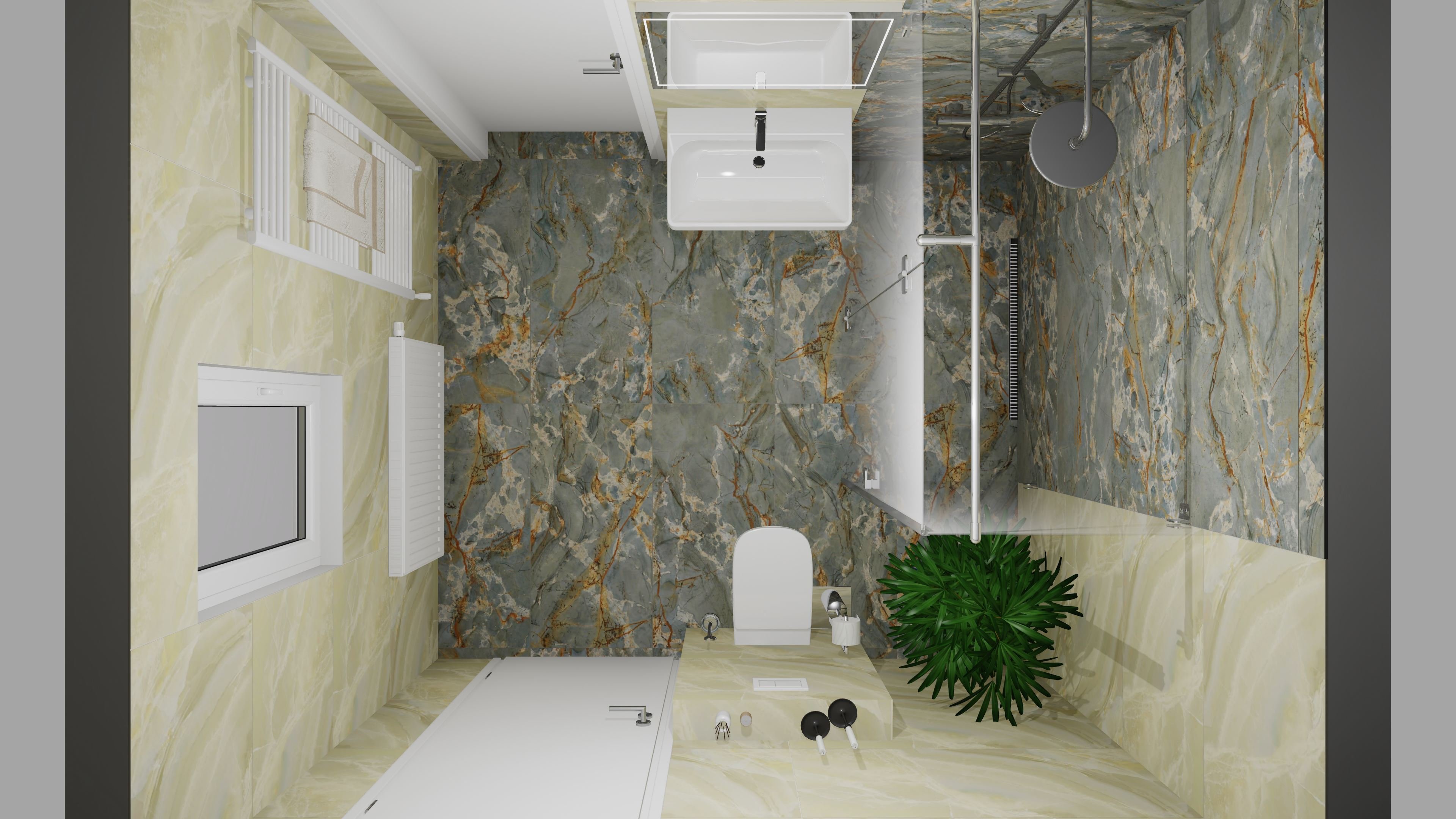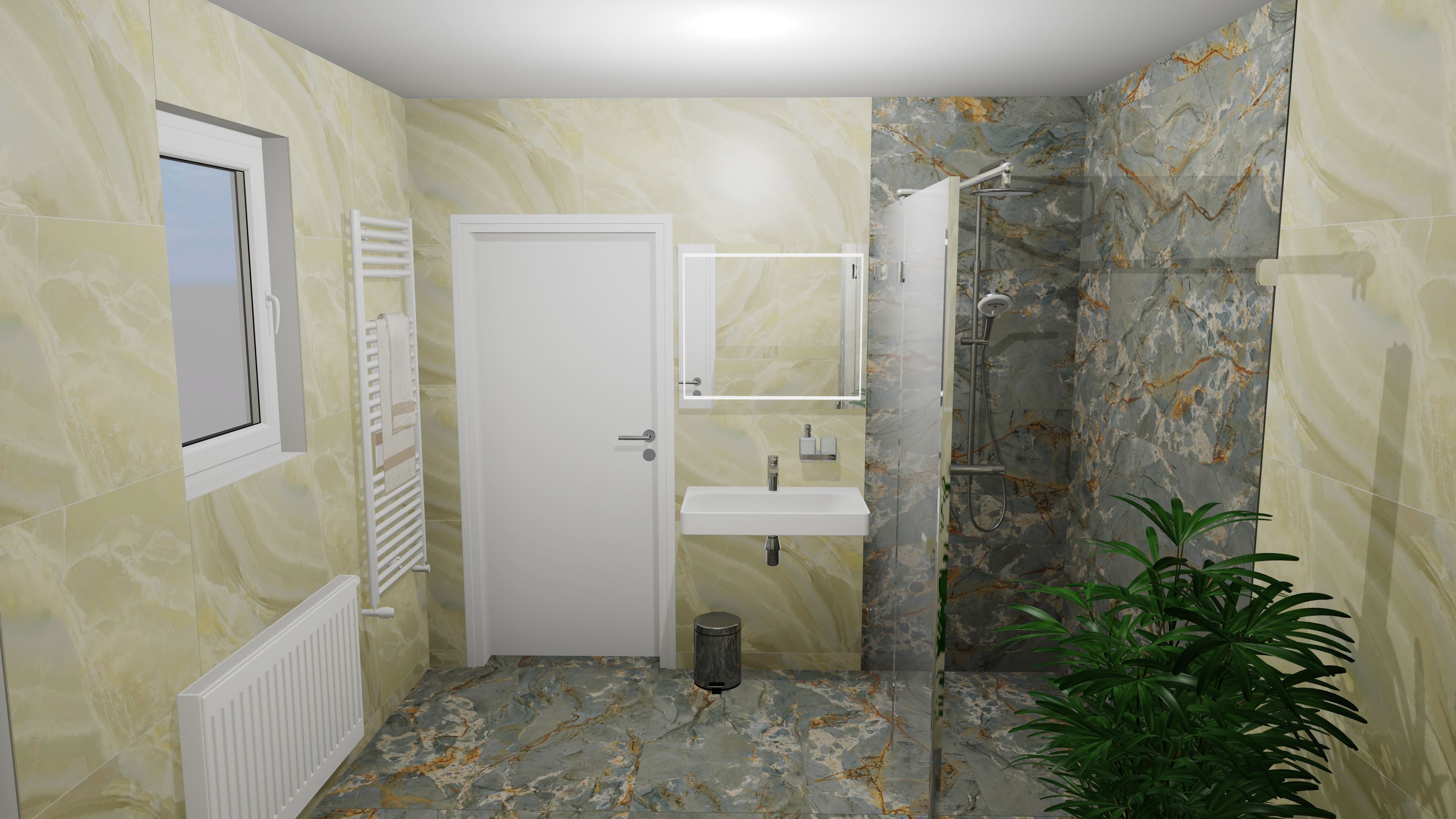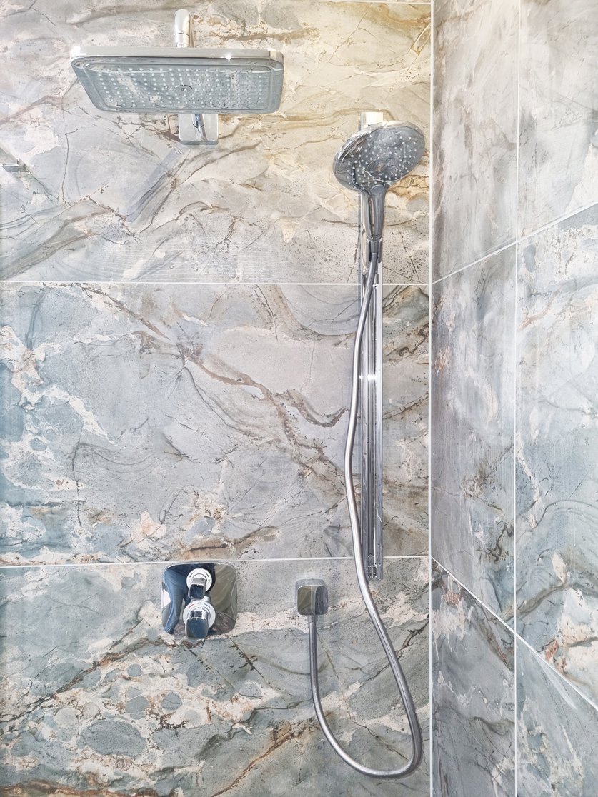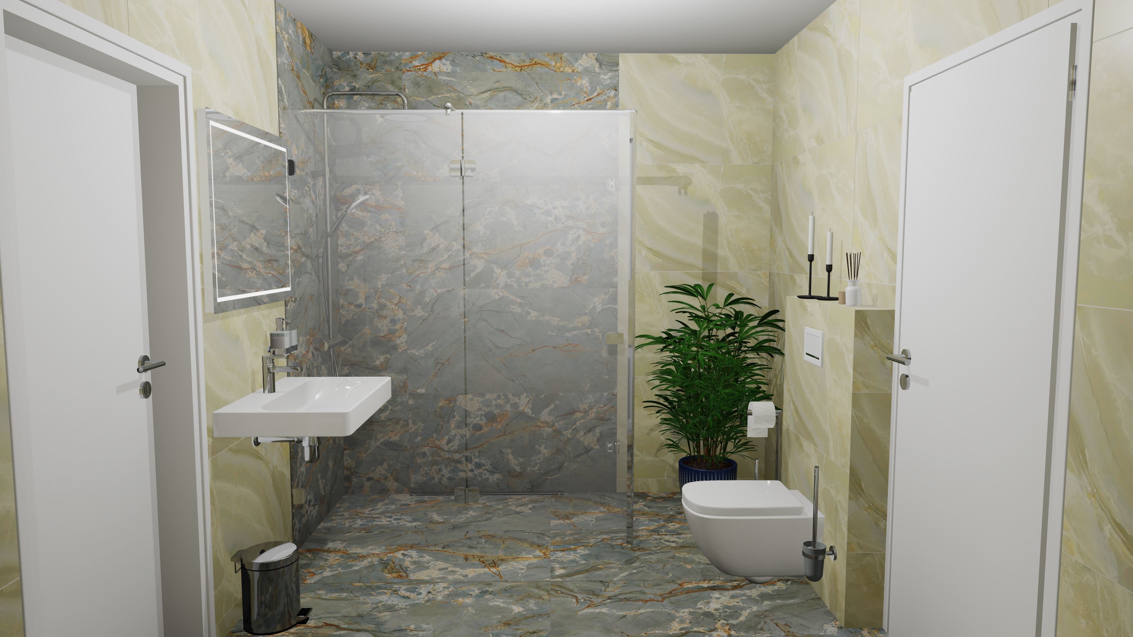 Celý koncept koupelny stojí na použití výrazné dlažby a obkladů s mramorovou kresbou a polychromatickými tóny. Zatímco stěny působí klidnějším dojmem díky světlé sérii Jade Green (Unica 60x120), podlaha a sprchový kout přinášejí dramatický efekt díky keramice Sensi Signoria Roma Imperiale. Výsledkem je kontrast světla a hloubky.