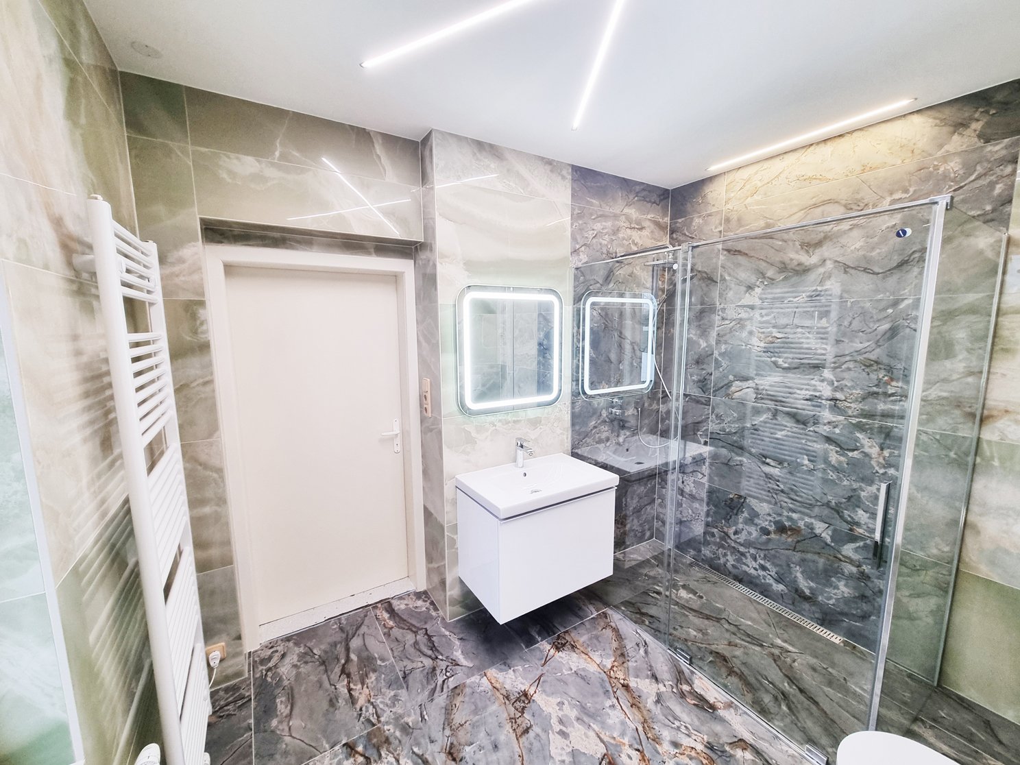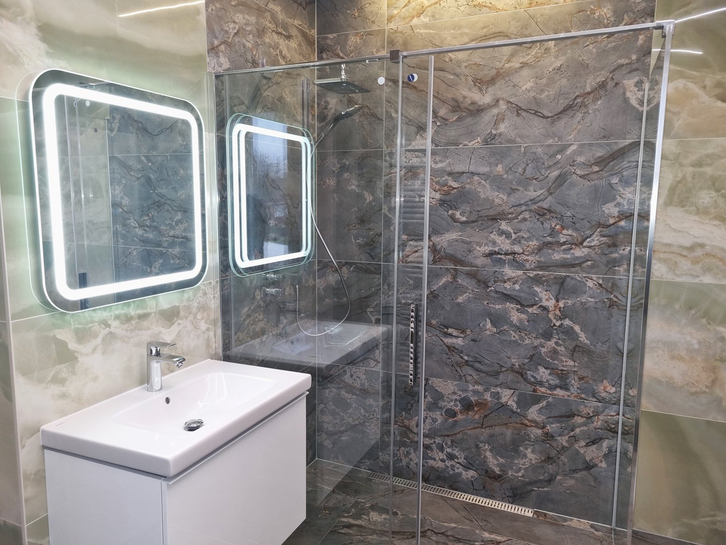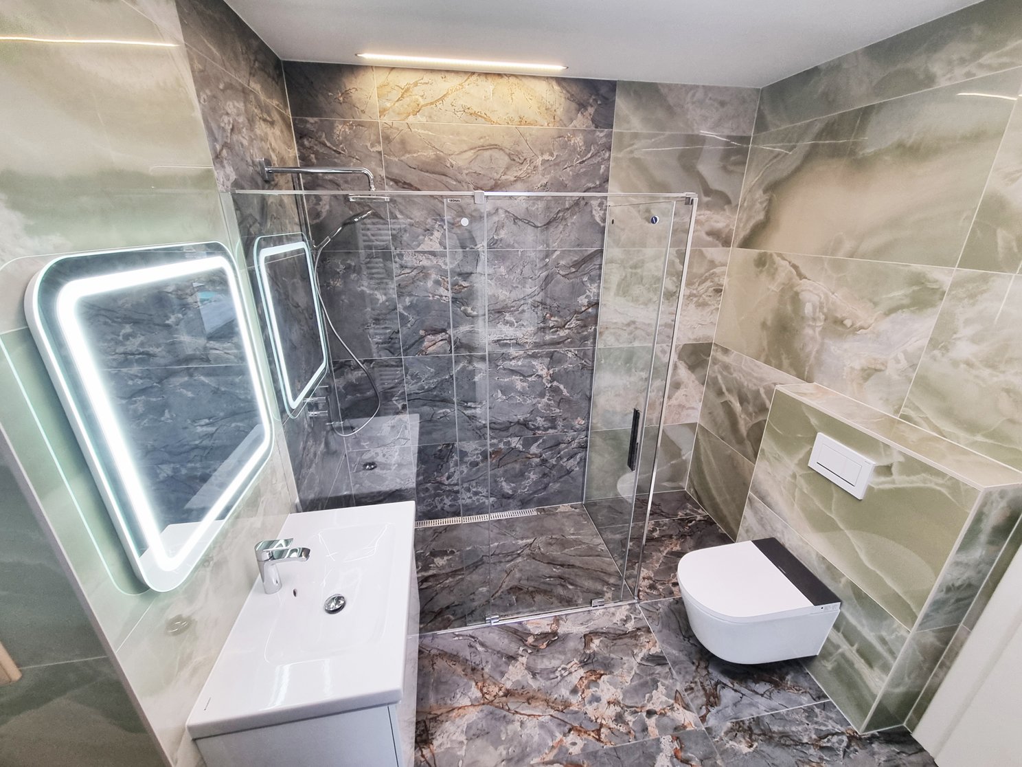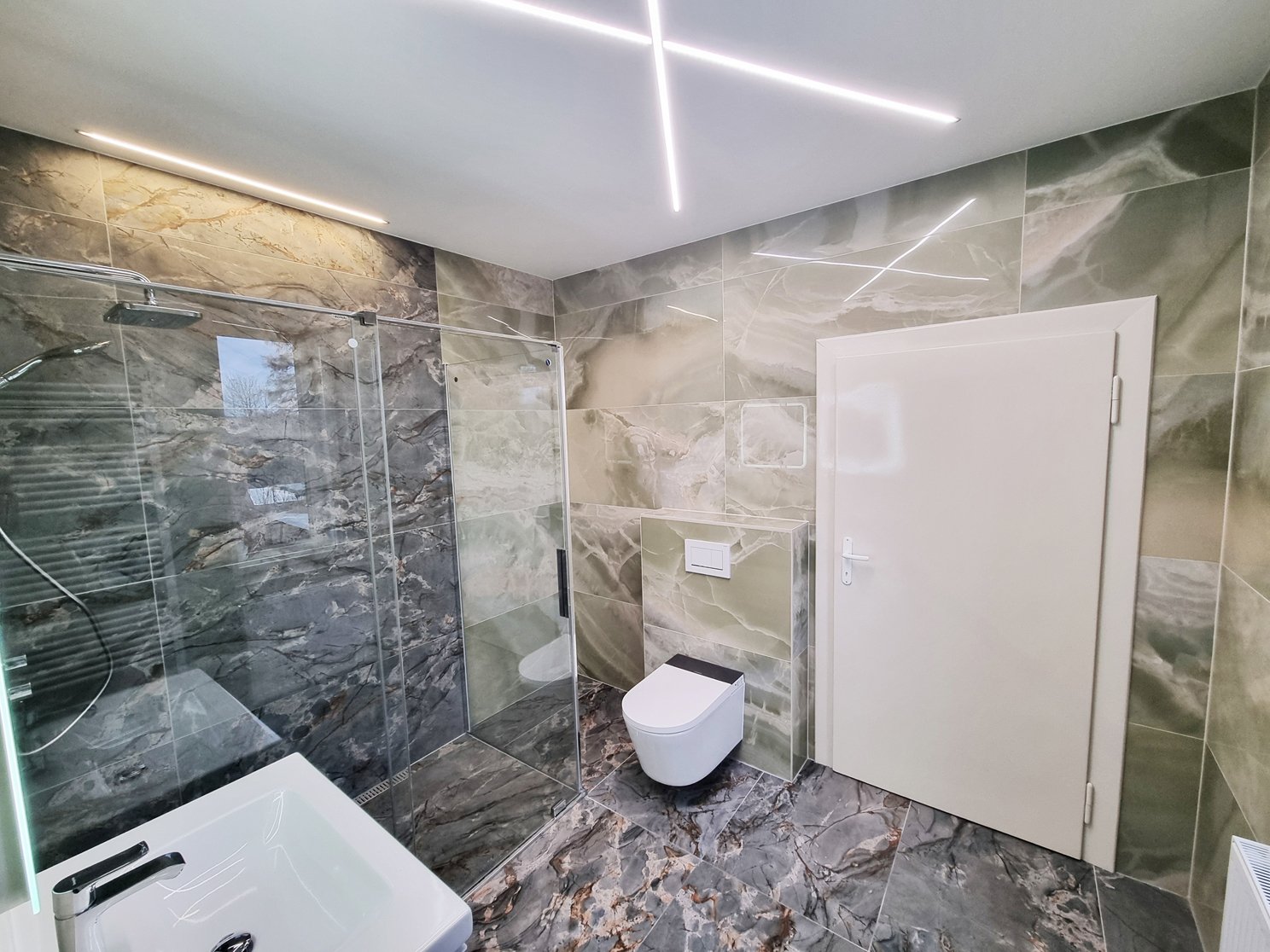 Rekonstrukce koupelny ve Svitavách je postavená na kvalitních materiálech a přesném provedení. Velkoformátové mramorové obklady v zemitých tónech, bezrámový sprchový kout RONAL AMALIA a sprchovací WC Watergate vytvářejí celek, který působí čistě a vyváženě.